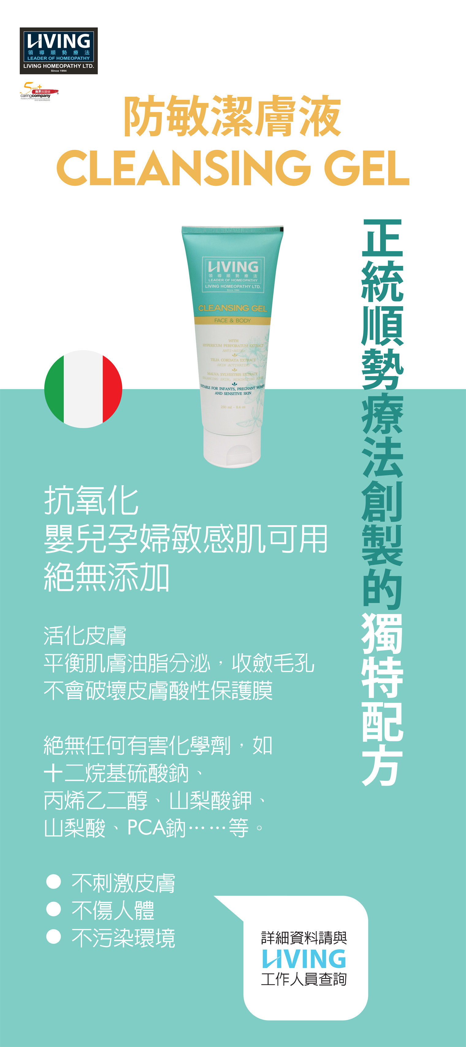 配方溫和,不含任何有害化學物質,如月桂醇硫酸鈉 (SLS/SLES)、丙二醇、山梨酸鉀、山梨醇、NaPCA 等等。成份天然,不會刺激皮膚,對身體無害,對環境無害。故亦適合孕婦,嬰兒使用。